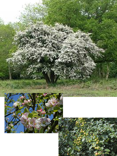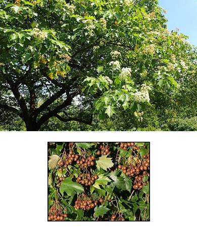 Flores blancas en corimbos aparecen entre abril y junio, dando lugar a frutos globosos de 15 mm, comestibles al madurar pero astringentes cuando están verdes.
