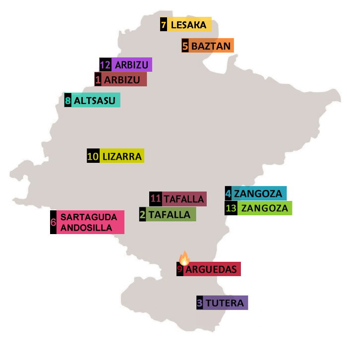 1 - Arbizu 2 - Tafalla 3 - Tudela 4 - Zangoza 5 - Baztan 6 - Sartaguda | Andosilla 7 - Lesaka 8 - Altsasu 9 - Arguedas 10 - Lizarra 11 - Tafalla 12 - Arbizu 13 - Zangoza